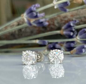 When shopping for diamond stud earrings you’ll want to first assess what size of diamond appeals to you. The standard, classic size is 5mm or the equivalent of 1/2 carat in each ear totalling 1 total carat weight. The next thing you’ll want to consider is the metal. A white metal will distract less from the diamond whereas a yellow or rose gold will be more contrasting. Also, be aware that some people have an allergy to the nickel in white gold. If you’re unsure of an allergy, but want a white metal, you could instead opt for platinum.