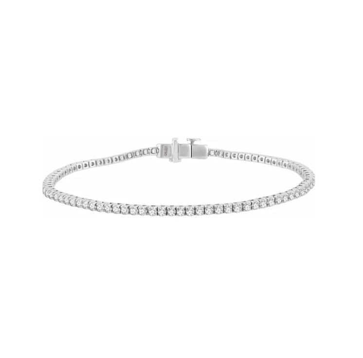 There are different styles of tennis bracelets and the diamonds can be of various size and set in various ways. The classic tennis bracelet has the diamond set in a four prong setting, with diamonds ranging in size from 2 to 3mm.