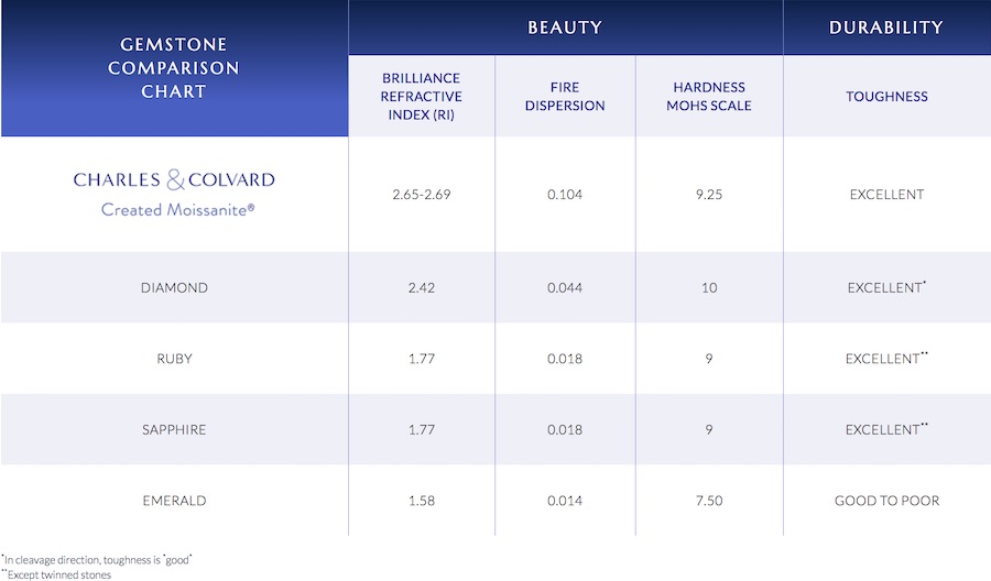 Due to its rarity natural moissanite, ie: mined from the earth, is not widely available. Instead it was synthesized in a labratory and is now commercially available from Charles and Colvard. It has a number of applications but the most important to us here is as a beautiful gemstone in jewellery.